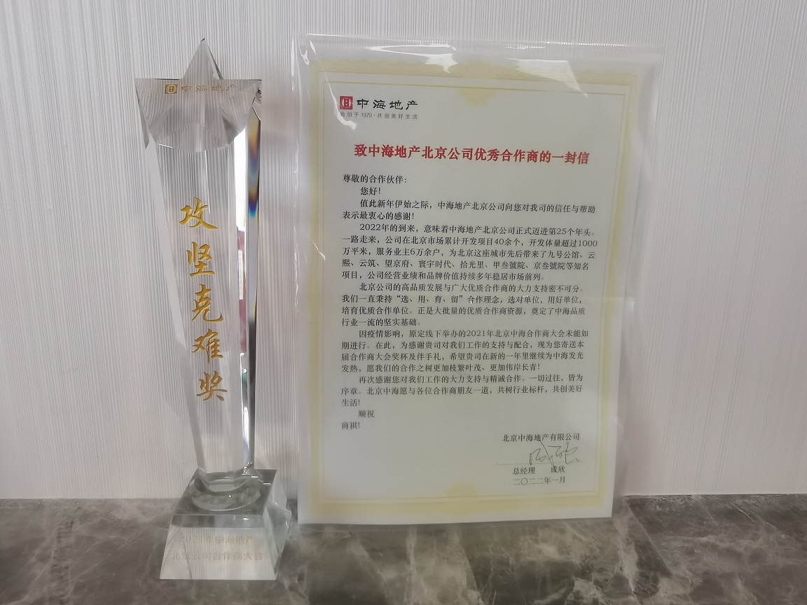 我司榮幸獲得中海地產(chǎn)北京公司攻堅克難獎,榮譽來之不易,未來繼續(xù)奮斗,特別感謝近年來的中海項目履約團隊!
